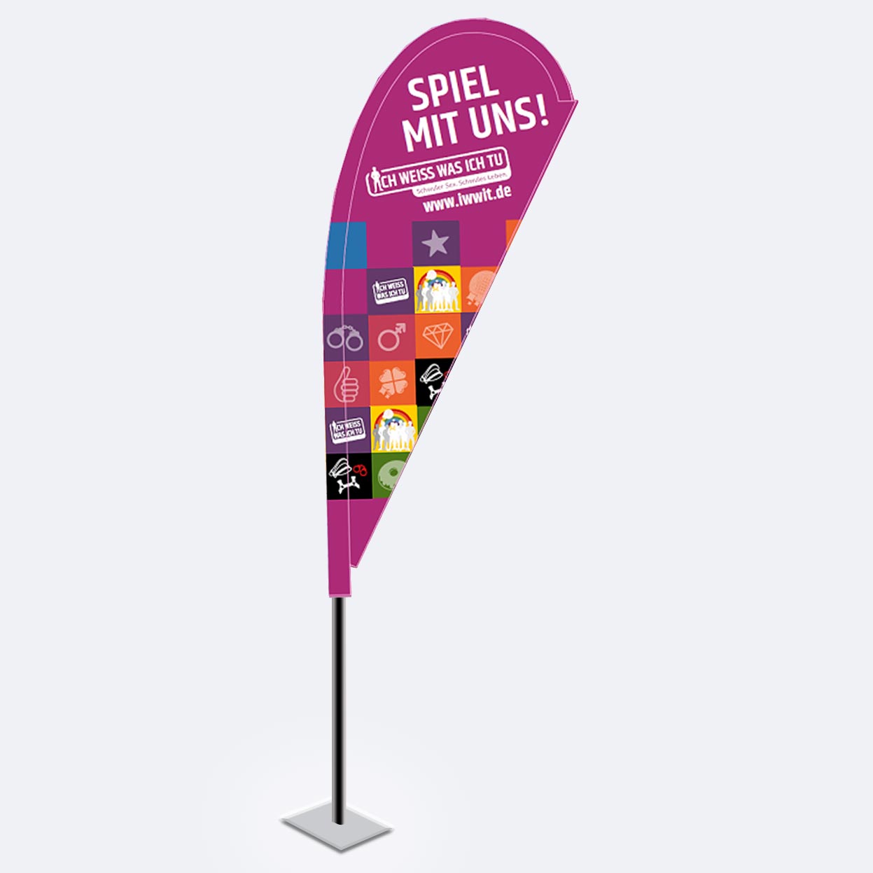Beach-Flag in Tropfenform Standhöhe ca. 2,40m Bedruckte Fläche ca. 2,0m hoch Steckbarer Fahnenmast im Ziehschlaufenbeutel Lieferung mit Bodenplatte (ca. 2,7kg Stahl), Transporttasche mit Einschubfächer sowie Schlauchgewicht ca. 10 Liter befüllbar mit Wasser oder Sand (zur Stabilisierung im Outdoor-Bereich bei Wind).